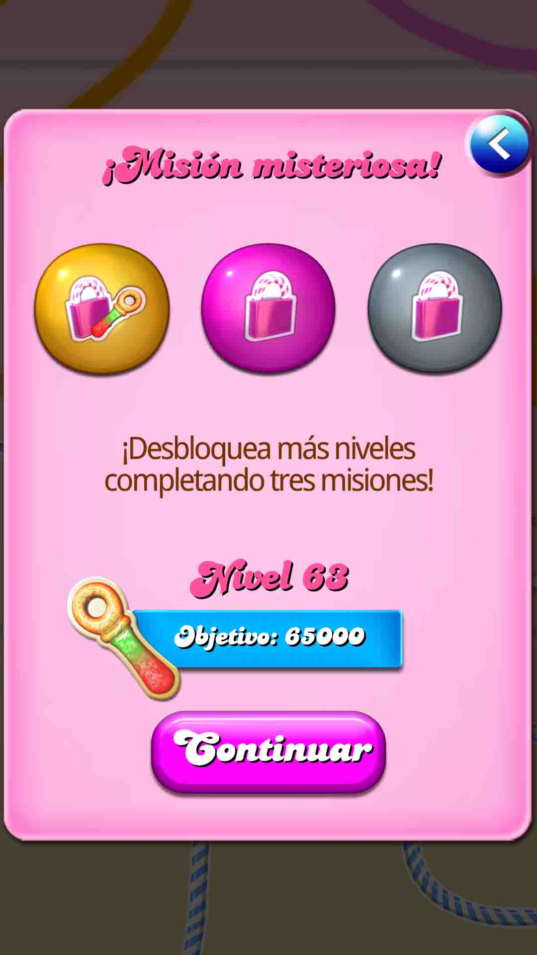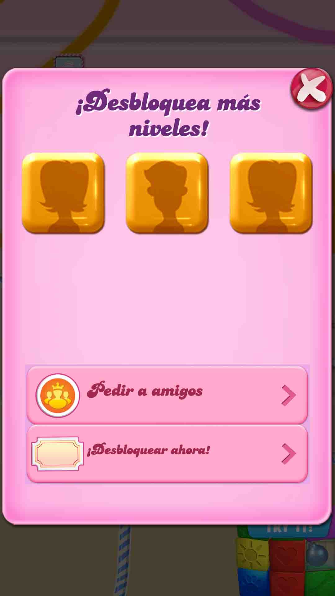 Para nuestra suerte y nuestra salud mental, a ver que hacemos en la vida sin Candy Crush, hay una posibilidad de desbloquear más niveles sin necesidad de dar la brasa a tus amigos de Facebook, (esto sería reconocer públicamente tú adicción y tú desesperación por más niveles), y sobretodo, sin necesidad de gastar nada de dinerito, Atent@: 1. Cierra Candy Crush completamente, es decir, "Mata la tarea" 2. Pon tu teléfono en modo avión. 3. Entra nuevamente en Candy Crush y ¡Magia! 4. Ahora te dan una tercera opción para desbloquear "jugar en misones". Estas misiones son tres pantallas que deberás superar, cada una de ellas con una diferencia de tiempo de 24 horitas (cabroncetes). Una vez superadas se te abre un “nuevo mundo” y puedes seguir dale que te pego al caramelito.¡ATENCIÓN REGALO! Guía Gratis Repleta de trucos!